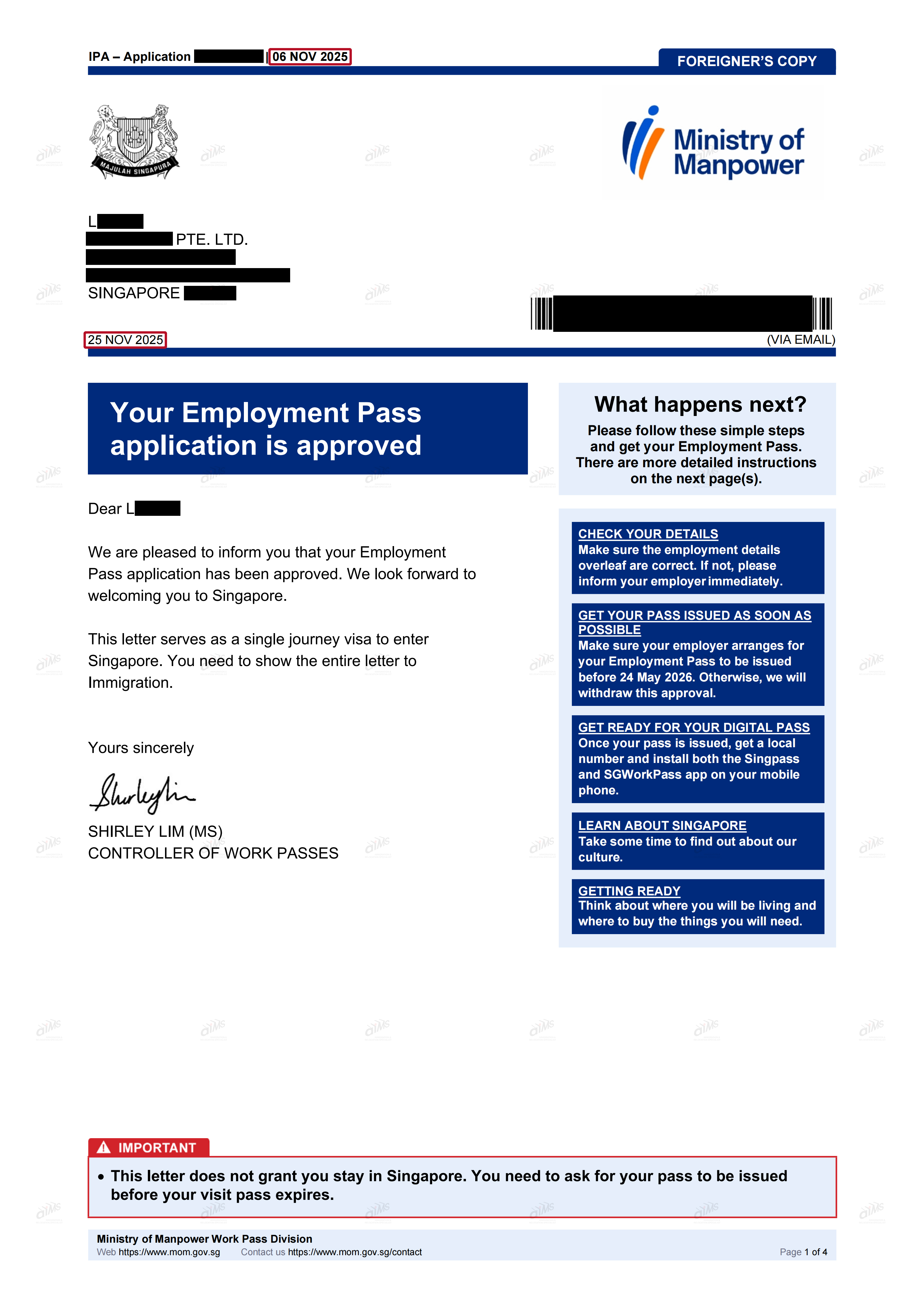 在提交申请后,L先生的自雇EP仅用了19天就成功获批,这一高效的审批周期再次体现了爱慕斯在高技术行业人才申请中的专业性和高效性。