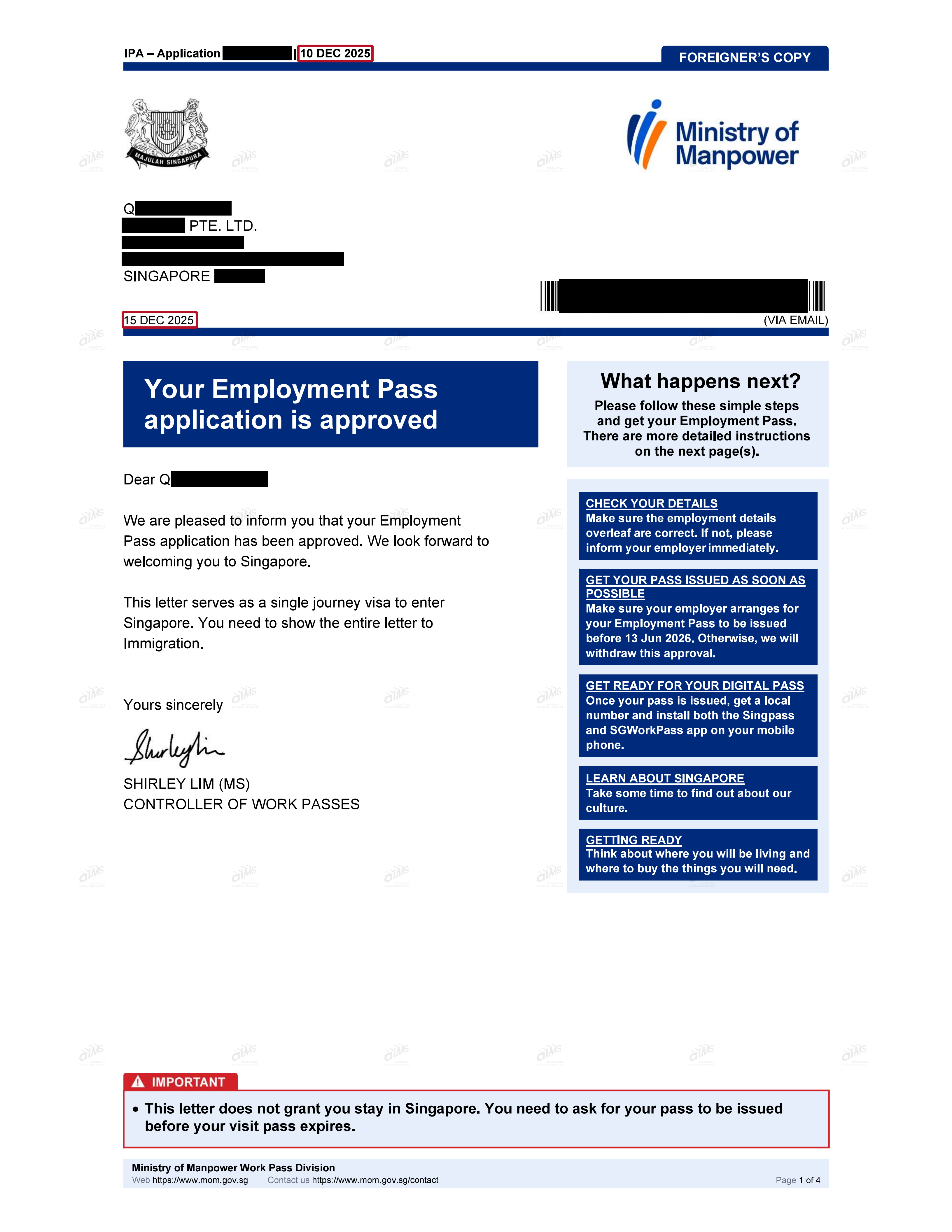 此次获批将为Q先生提供一个稳定的商业平台,让他能够在新加坡独立开展软件开发业务,并进一步拓展客户群体。成功获得自雇EP后,Q先生也为未来申请新加坡永久居民(PR)打下了坚实的基础。