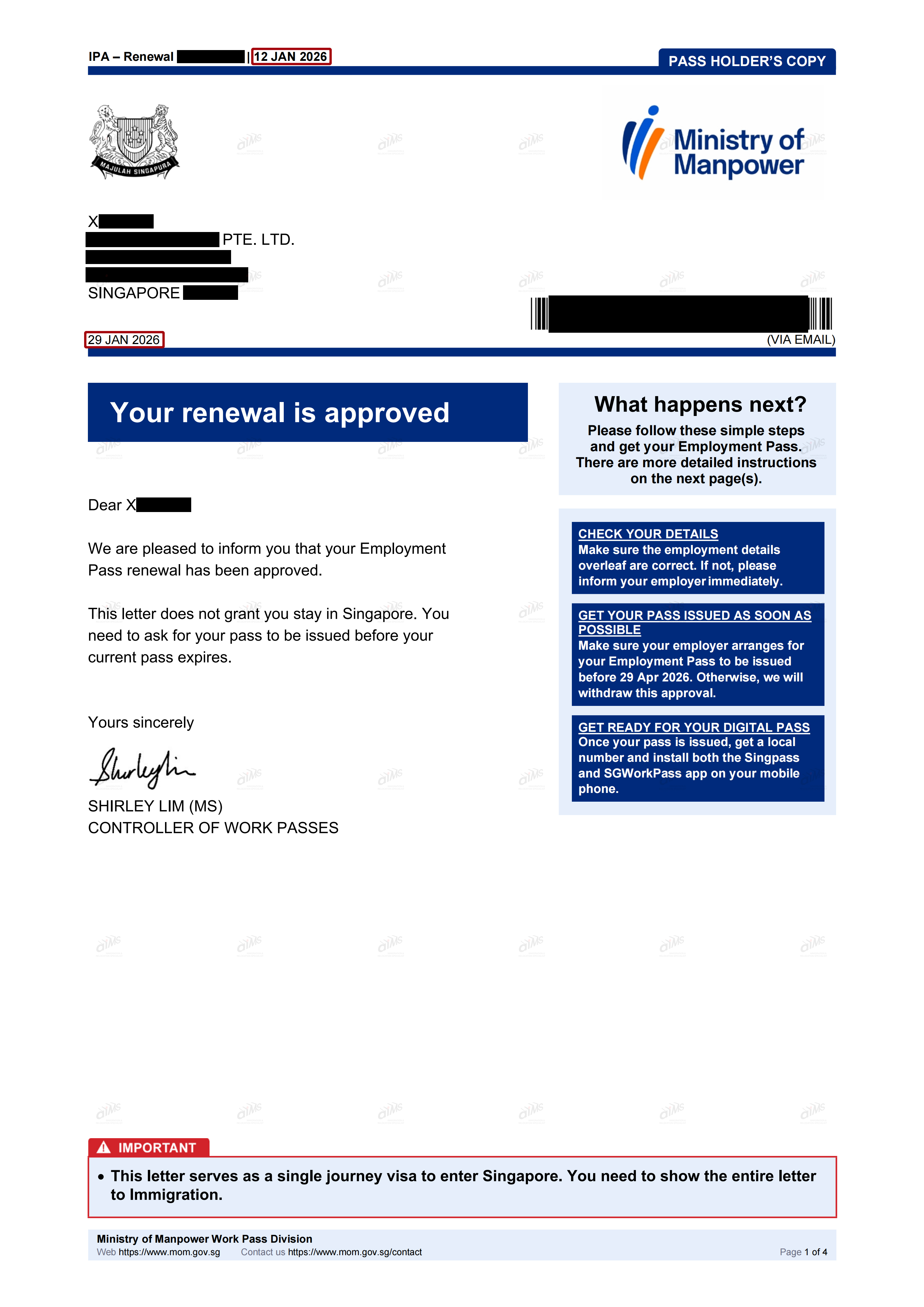 经过约两周时间的审批流程,X先生顺利获得自雇EP批准。这一结果不仅体现了新加坡对专业工程与可持续发展领域人才的认可,也再次验证了爱慕斯在专业技术类自雇EP项目中的实操经验与精准规划能力。