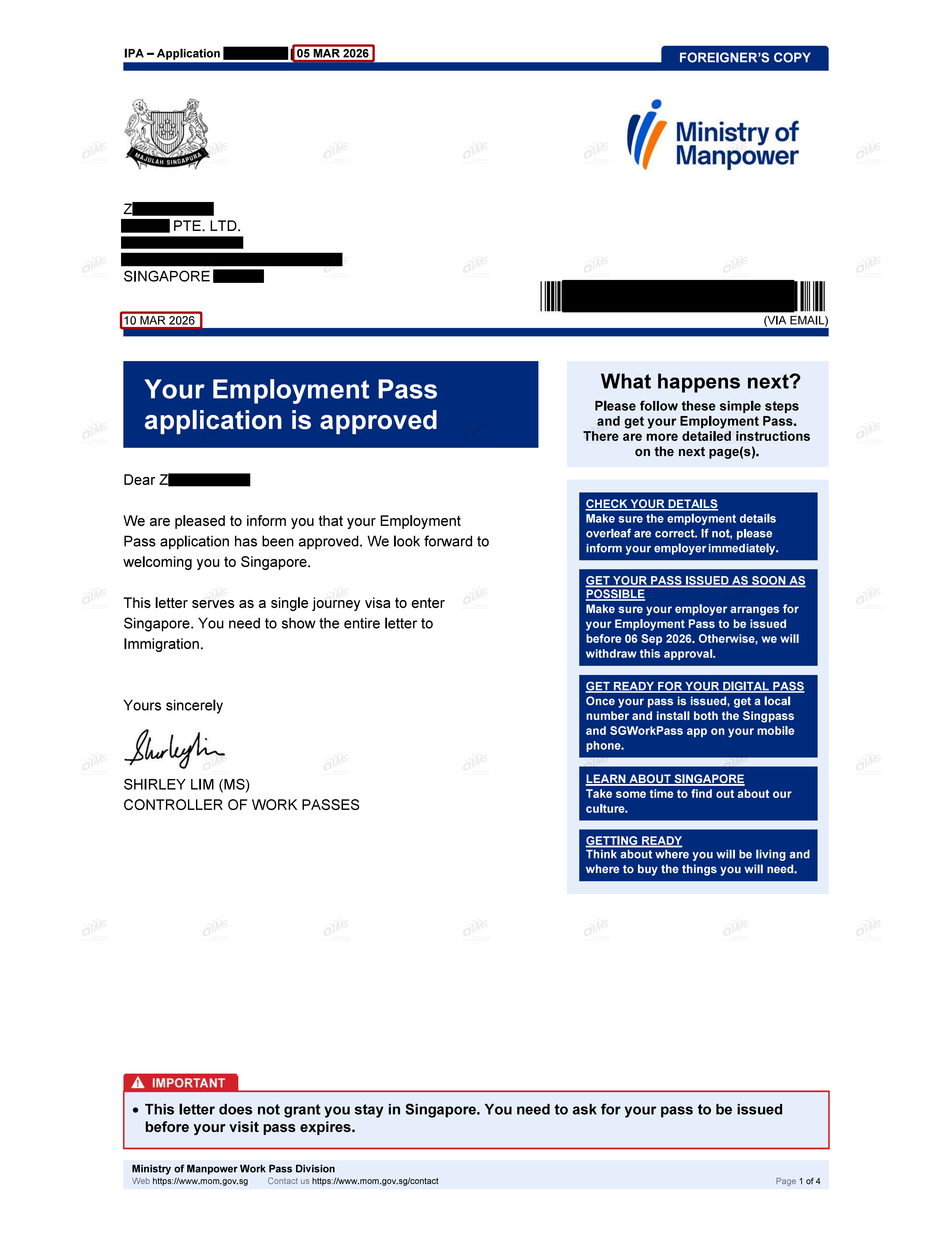 从提交到获批仅用5天,审批流程高效顺畅。这一结果体现了新加坡对专业服务型企业与管理类人才的认可,也再次验证了爱慕斯在自雇EP项目中的专业规划能力与执行效率。